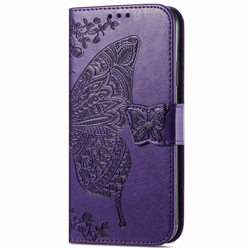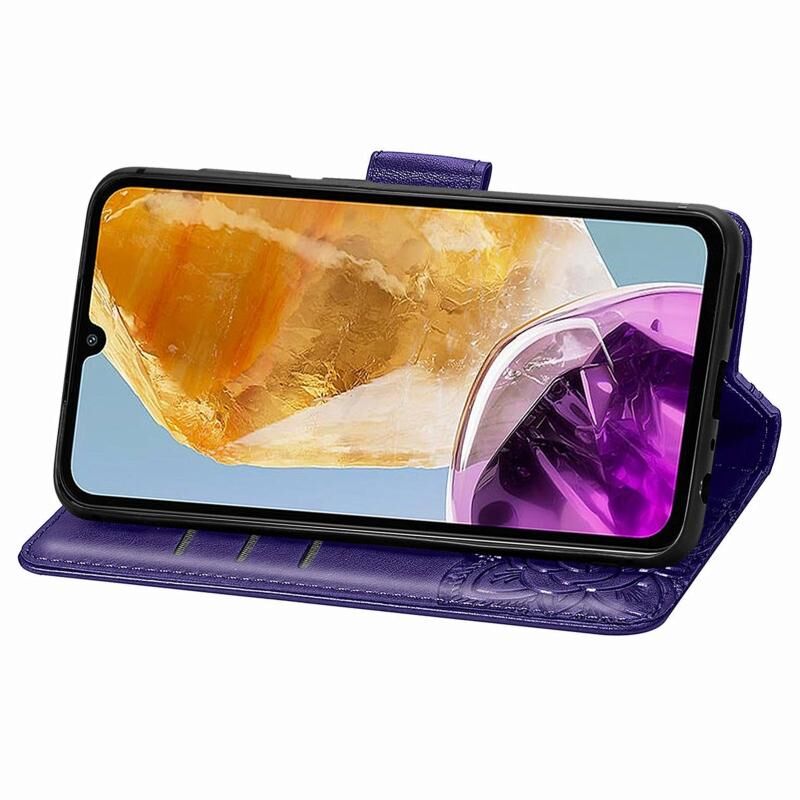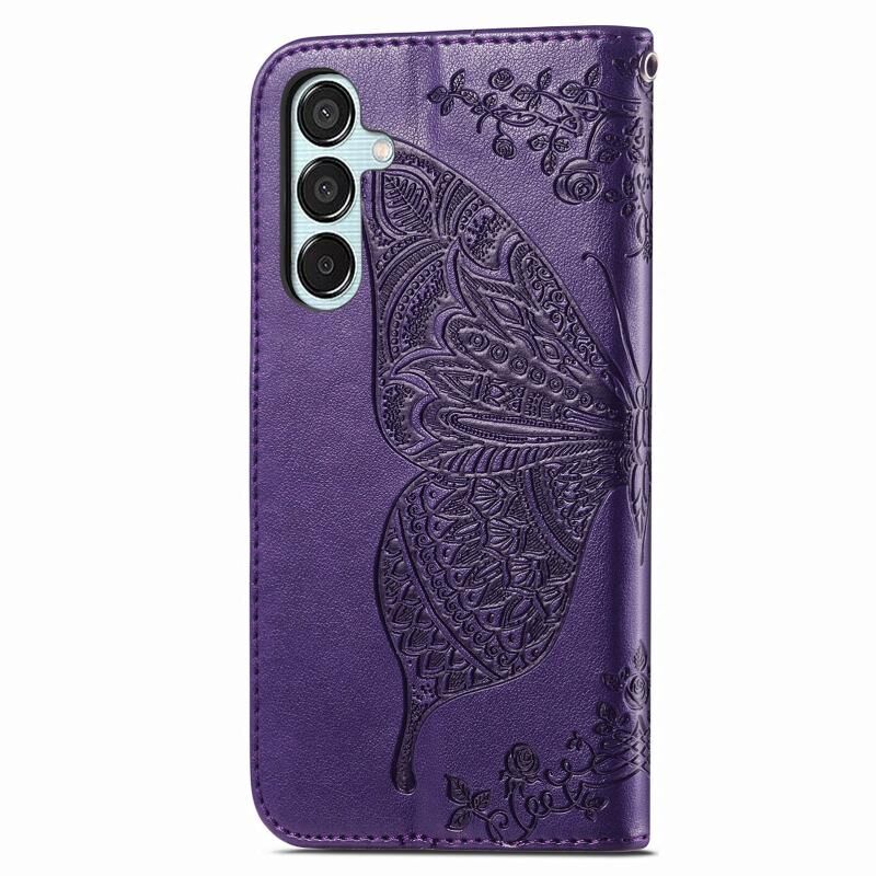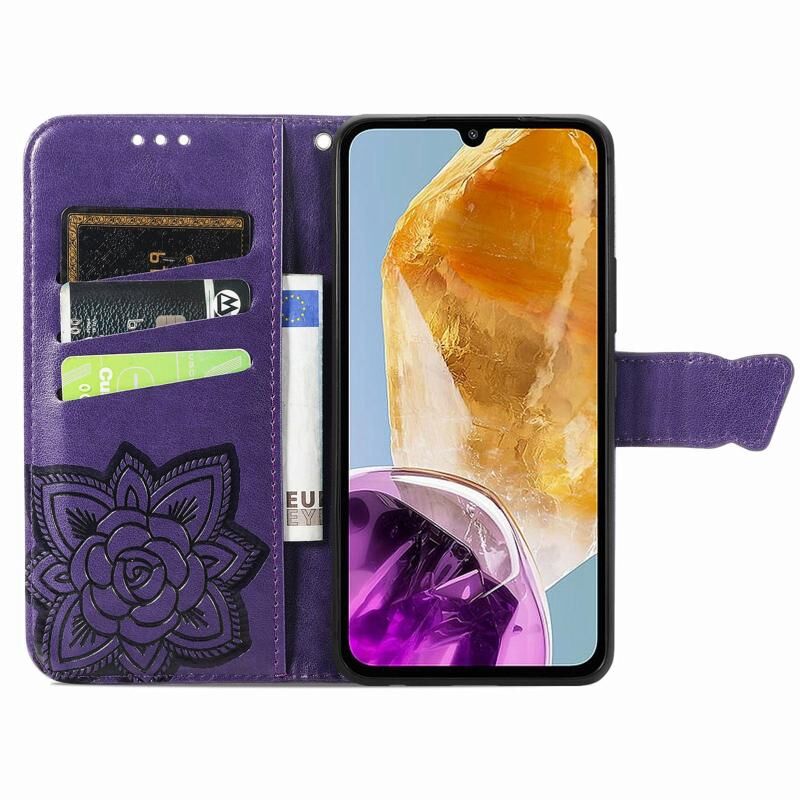 Για Samsung Galaxy M15 πεταλούδα αγάπη λουλούδι ανάγλυφο δερμάτινη θήκη τηλεφώνου (σκούρο μωβ)