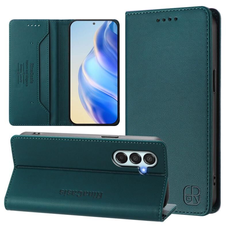 Θήκη τηλεφώνου δέρματινη με μαγνητική απορρόφηση και διπλή πτύχωση για Samsung Galaxy M15 / F15 5G Global RC01 (Σκούρο πράσινο)