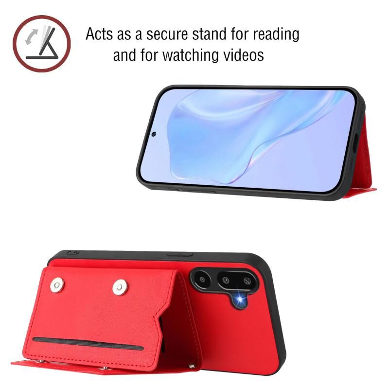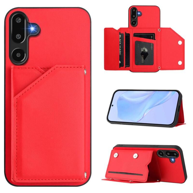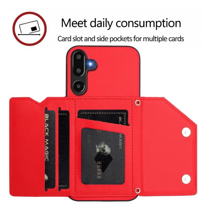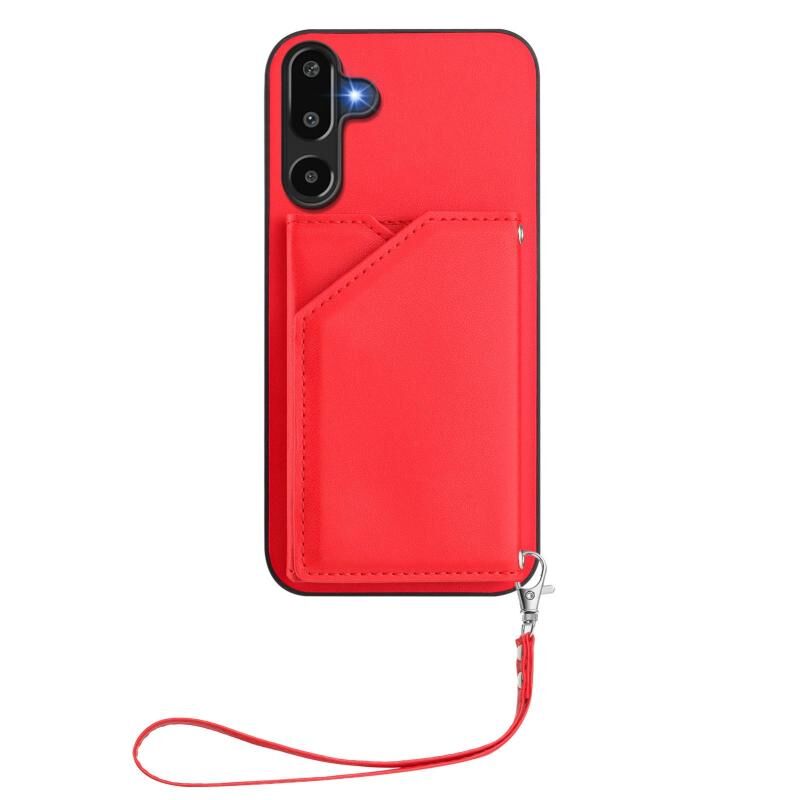 Θήκη τηλεφώνου για Samsung Galaxy M16 5G / F16 5G με υφή δέρματος, τέσσερις θήκες για κάρτες και λουρί καρπού (Κόκκινο)