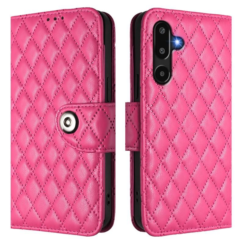 Θήκη τηλεφώνου Samsung Galaxy M16 5G Global με δερμάτινη υφή ρόμβου και λουρί (Ροζέ κόκκινο)