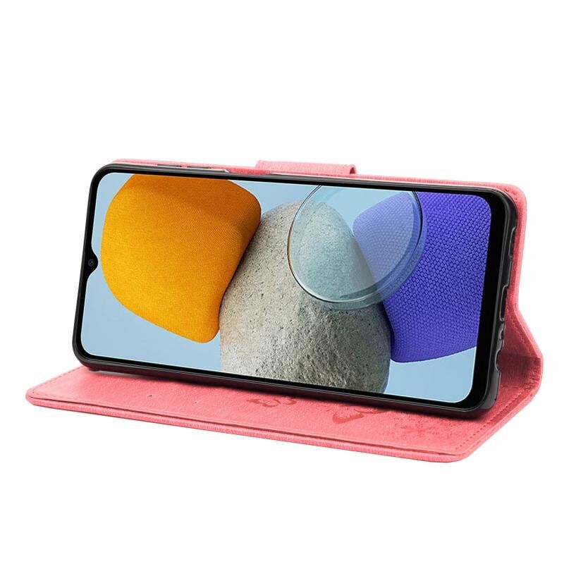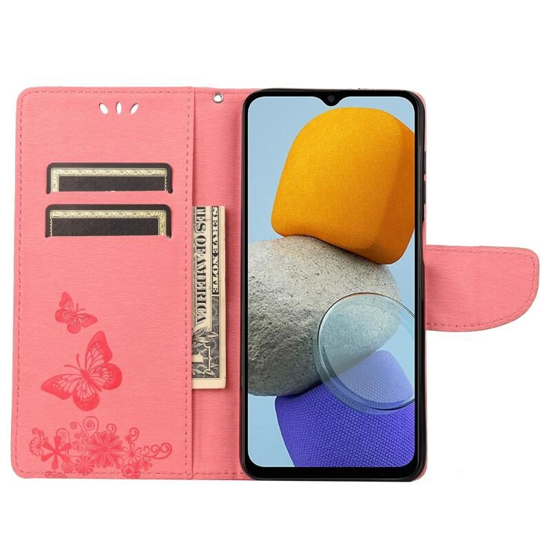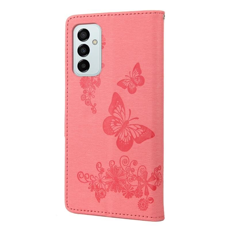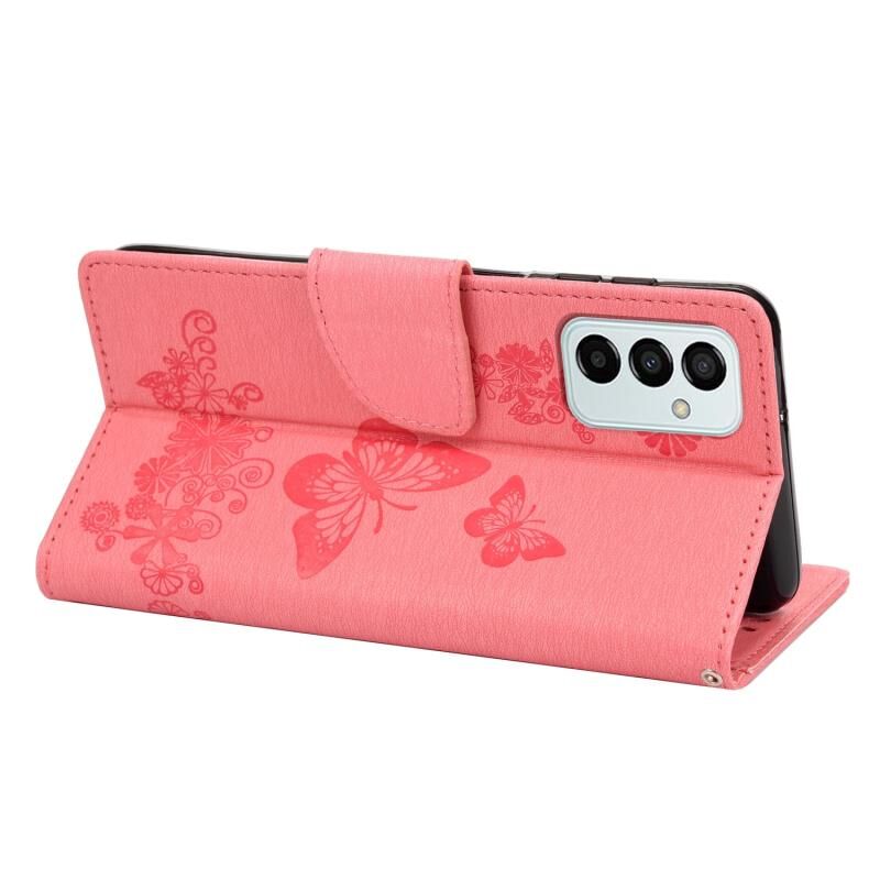 Θήκη τηλεφώνου Samsung Galaxy M23 5G με ανάγλυφο σχέδιο πεταλούδας από δέρμα (ρόζ)