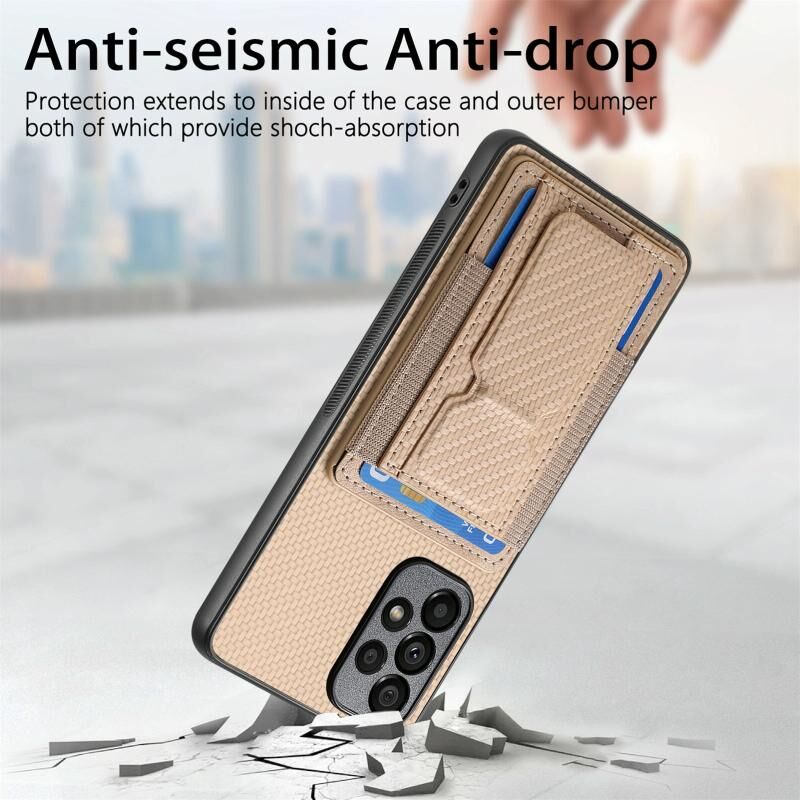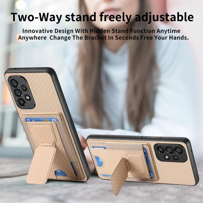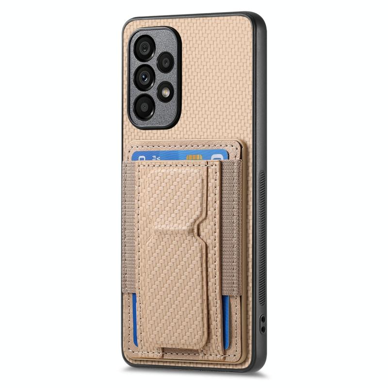 For Samsung Galaxy M23 5G Carbon Fiber Fold Stand Elastic Card Bag Phone Case(Khaki)