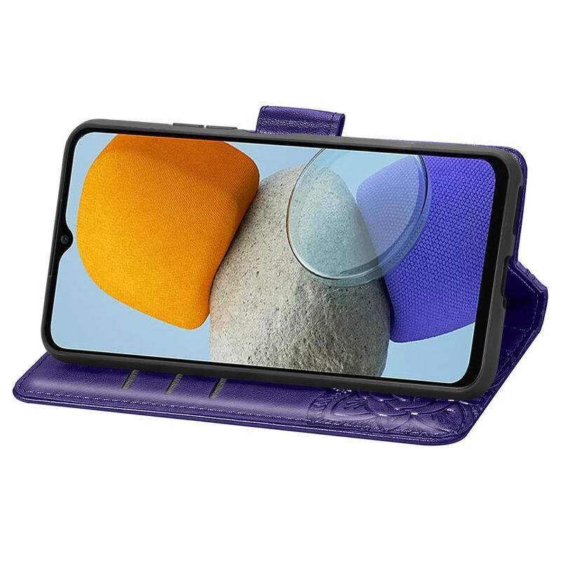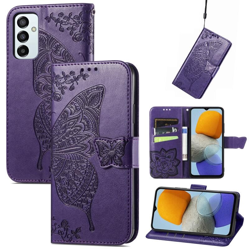 Για Samsung Galaxy M23 πεταλούδα αγάπη λουλούδι ανάγλυφο δερμάτινη θήκη τηλεφώνου (σκούρο μωβ)