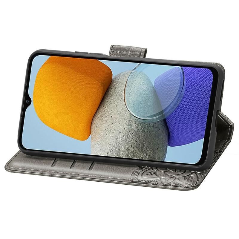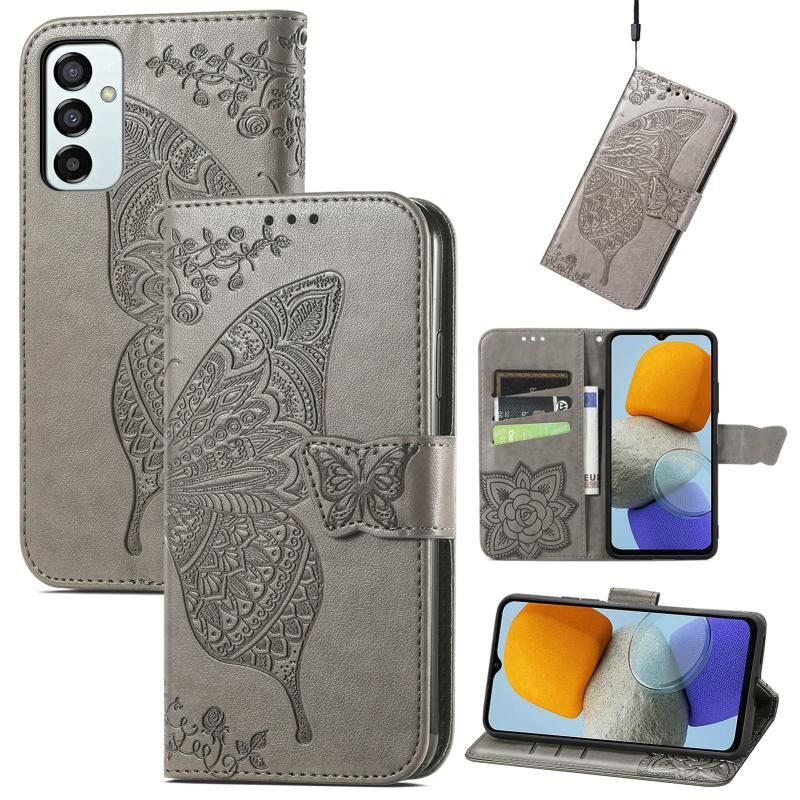 Για Samsung Galaxy M23 πεταλούδα αγάπη λουλούδι ανάγλυφο δερμάτινη θήκη τηλεφώνου (γκρι)