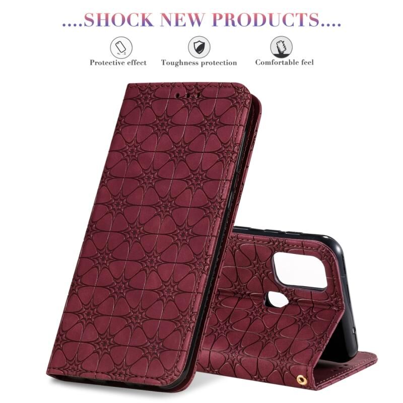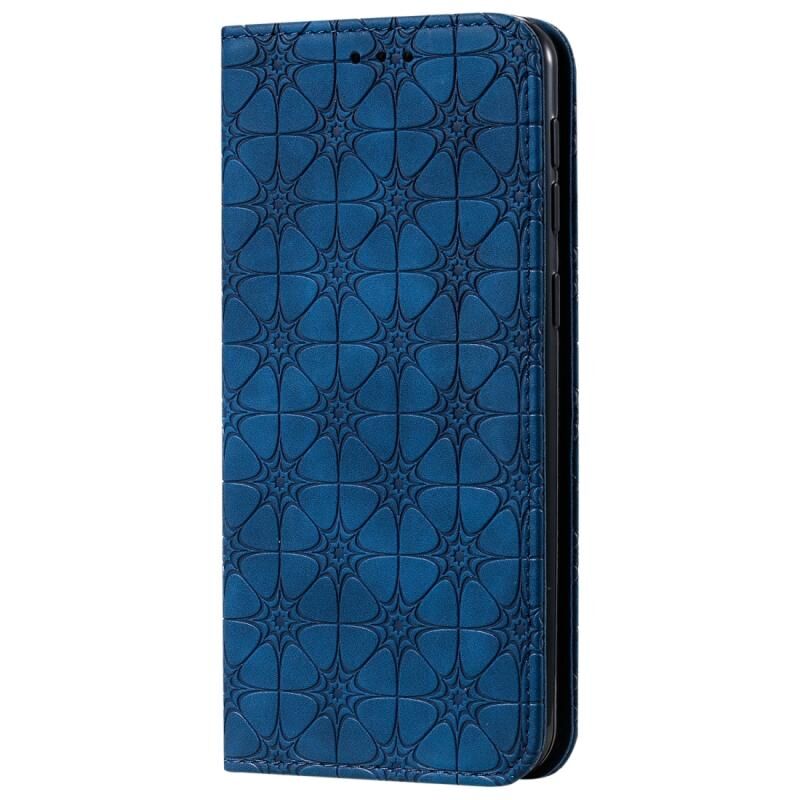 Θήκη Samsung Galaxy M31 με μαγνητικό κλείσιμο, δερμάτινη, οριζόντια, με ανάγλυφο σχέδιο λουλουδιών, βάση στήριξης & θήκες για κάρτες (Σκούρο μπλε)