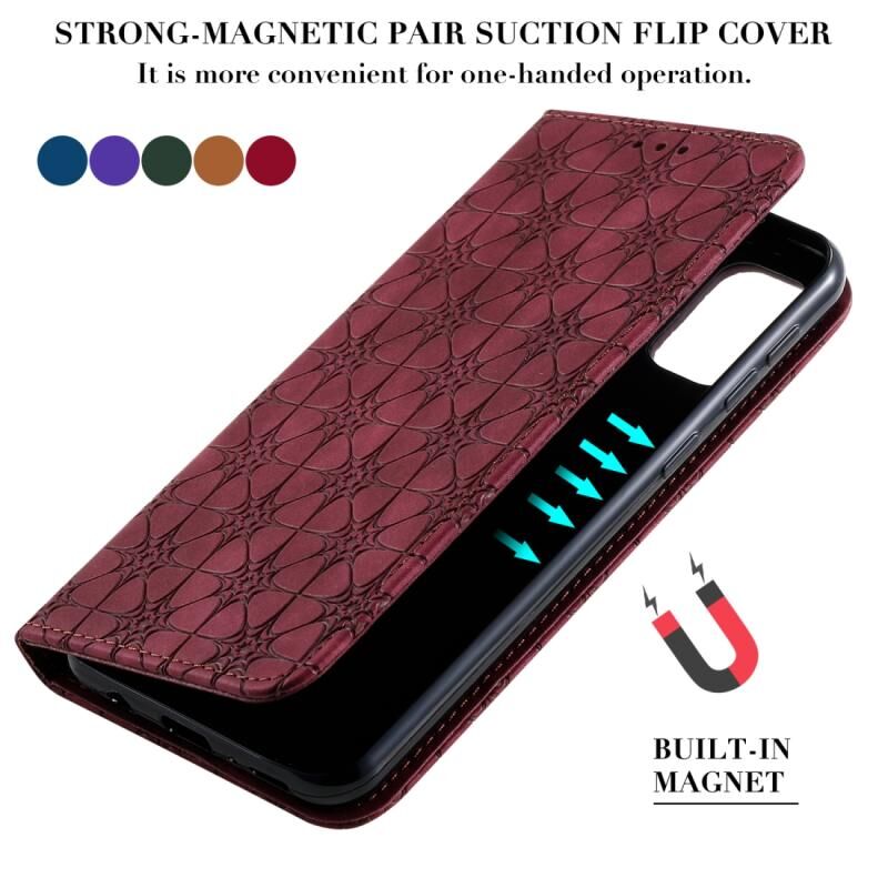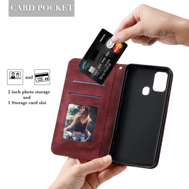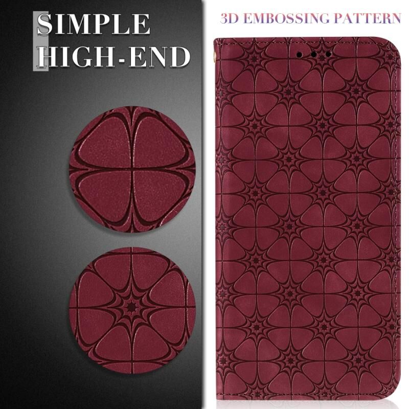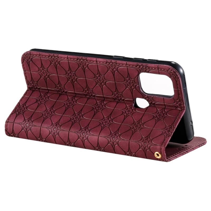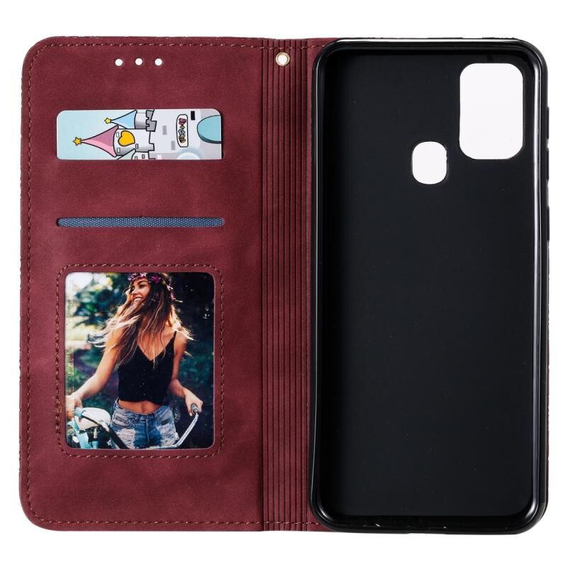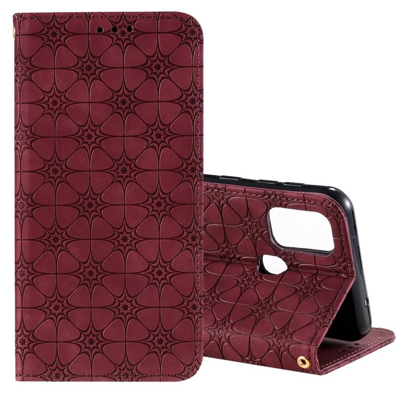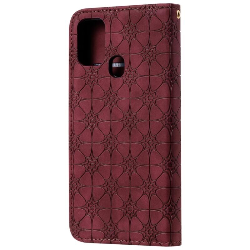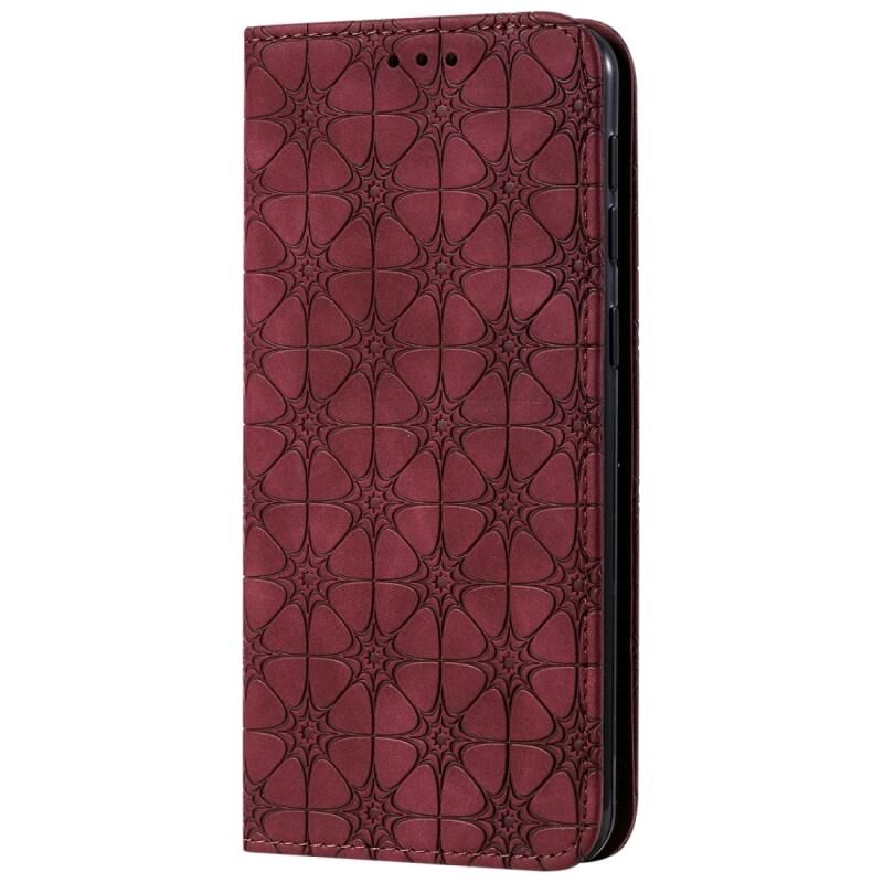 Θήκη Samsung Galaxy M31, Δερμάτινη Μαγνητική Οριζόντια Flip με ανάγλυφο σχέδιο Λουλουδιών, με βάση στήριξης & Θήκες για Κάρτες (Κρασοκόκκινο)