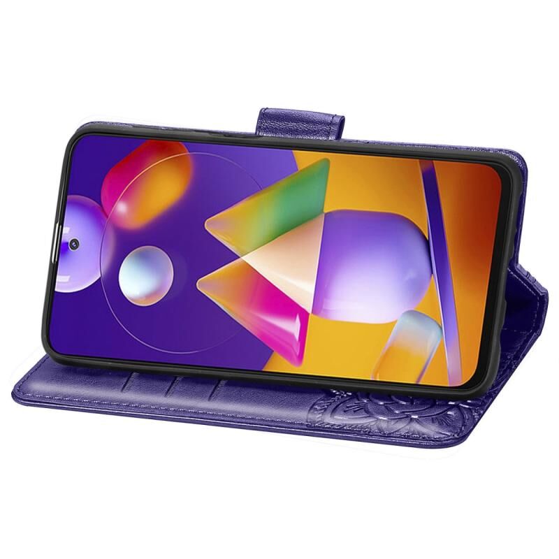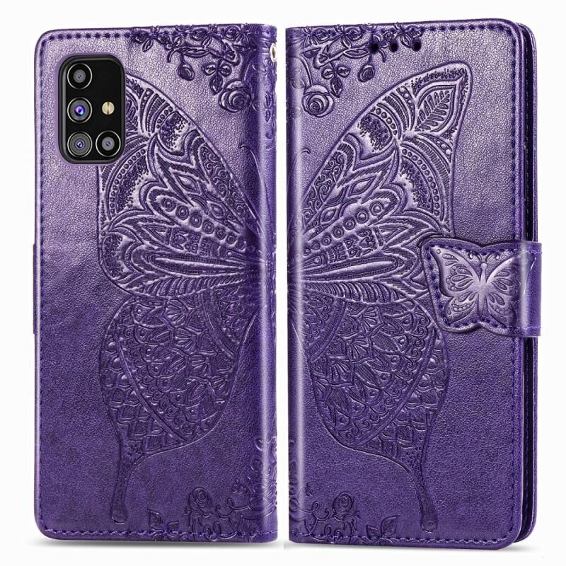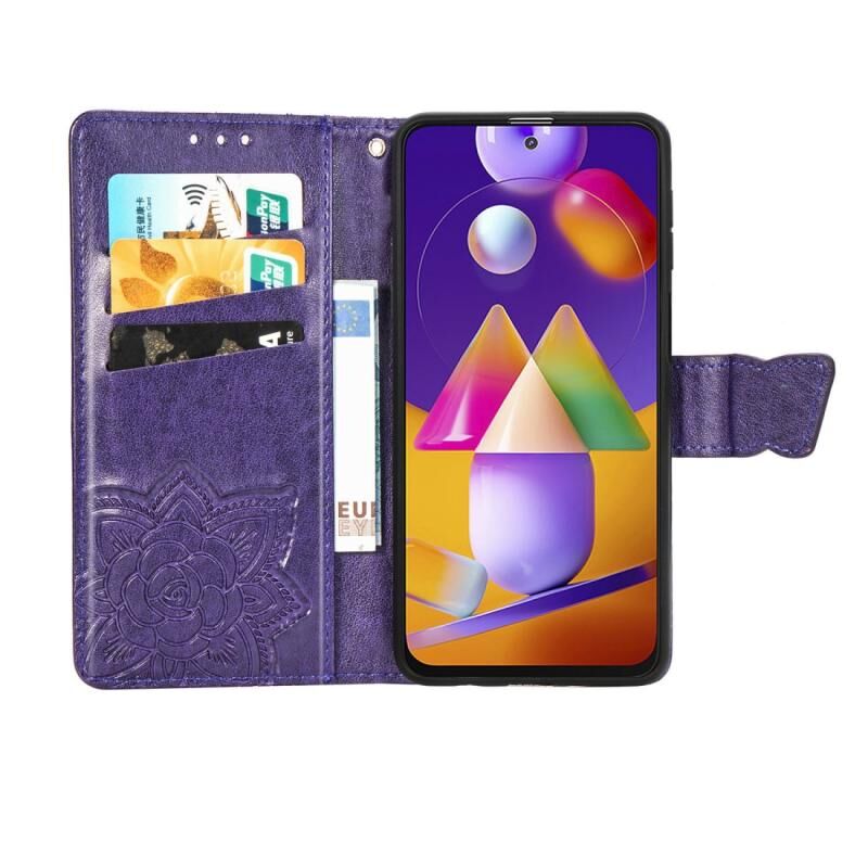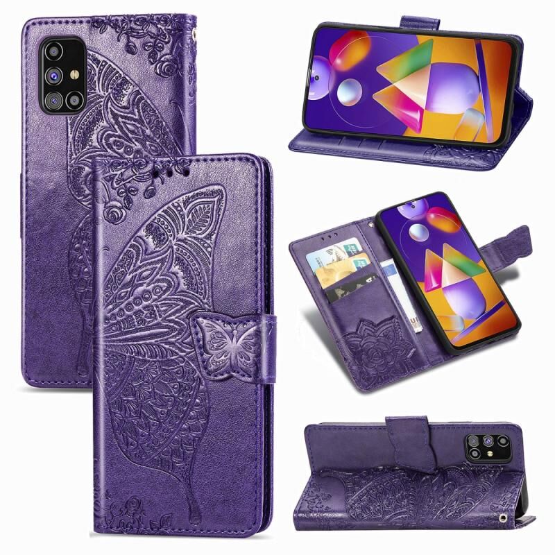 Θήκη Samsung Galaxy M31s, Πεταλούδα, Λουλούδια, Χαραγμένη, Οριζόντια, Δερμάτινη, με Στήριξη & Θήκες Καρτών & Πορτοφόλι & Λουρί (Μαύρο)