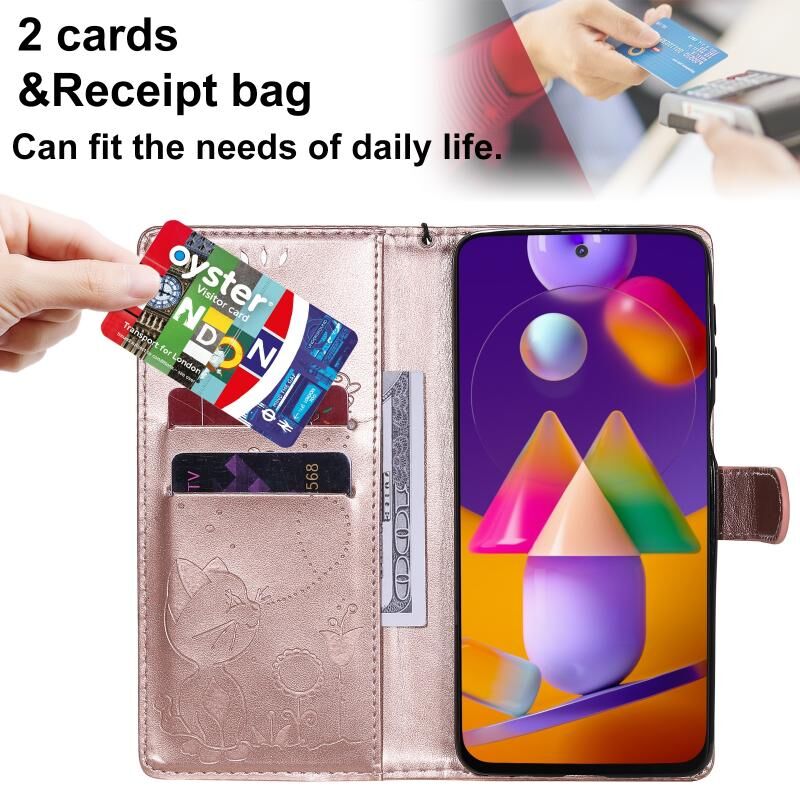 Θήκη Samsung Galaxy M31s Cat Bee με ανάγλυφο σχέδιο, αντικραδασμική, οριζόντια, από δέρμα με βάση & θήκες για κάρτες & πορτοφόλι (Μπλε)