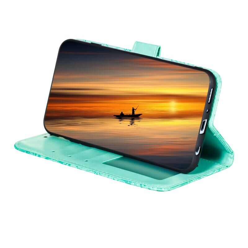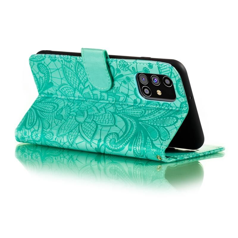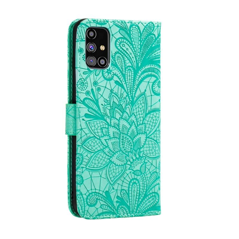 Θήκη Samsung Galaxy M31s δερμάτινη οριζόντια με λεπτομέρειες δαντέλας και λουλουδιών, με βάση στήριξης, θήκες για κάρτες, πορτοφόλι και κορνίζα φωτογραφίας (Χρυσό Ρόδινο). (πράσινο)