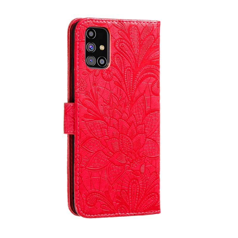 Θήκη Samsung Galaxy M31s δερμάτινη οριζόντια με λεπτομέρεια δαντέλας και λουλουδιών, με βάση στήριξης, θήκες για κάρτες, πορτοφόλι και κορνίζα φωτογραφίας (Γκρι)