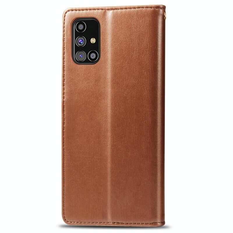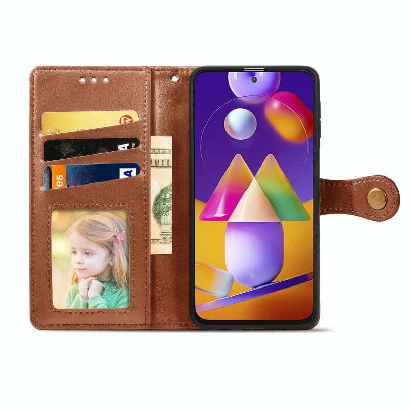 Για Samsung Galaxy M31s Αμιγές χρώμα δέρμα αγκράφα υπόθεση τηλεφώνου με κορδόνι & πλαίσιο φωτογραφιών & υποδοχή για κάρτες & πορτοφόλι & λειτουργία Stand (Καφέ)