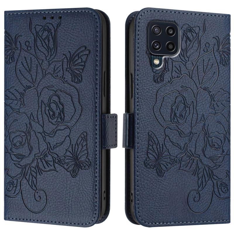 For Samsung Galaxy M32 4G Global / M22 Embossed Rose RFID Anti-theft Leather Phone Case(Dark Blue)