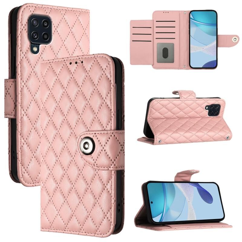 Θήκη τηλεφώνου Samsung Galaxy M32 4G / M22 με ανάγλυφη υφή ρόμβου, δερμάτινη, με κορδόνι (Κοραλλί ροζ)