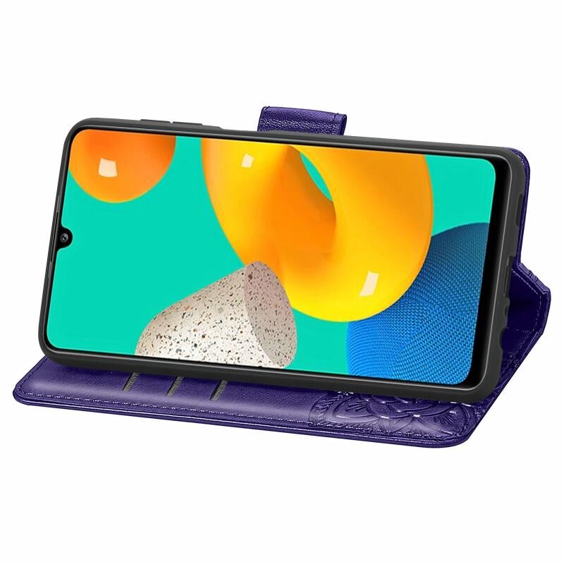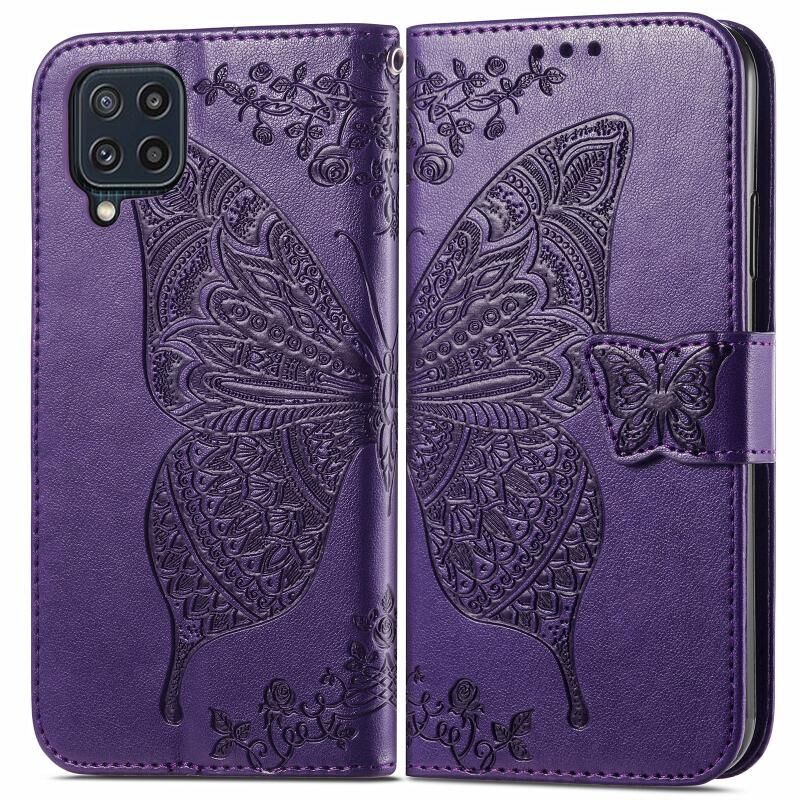 Για Samsung Galaxy M32 πεταλούδα αγάπη λουλούδια ανάγλυφο οριζόντια Flip δερμάτινη θήκη με κάτοχο & υποδοχές για κάρτες & πορτοφόλι & κορδόνι (σκούρο μωβ)