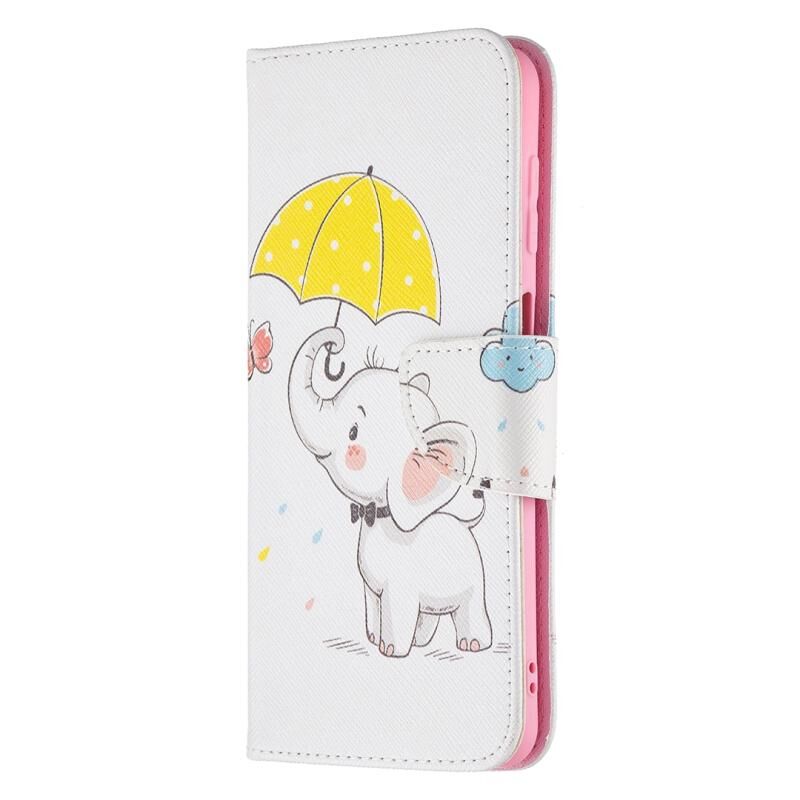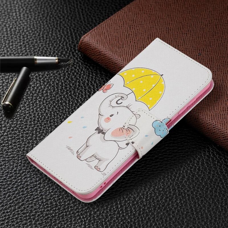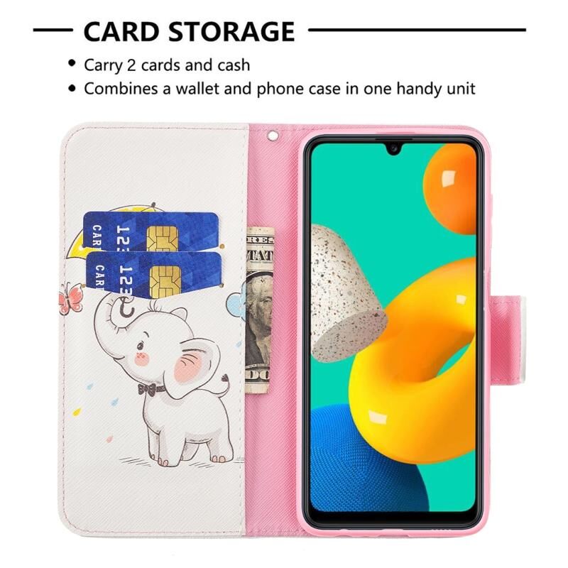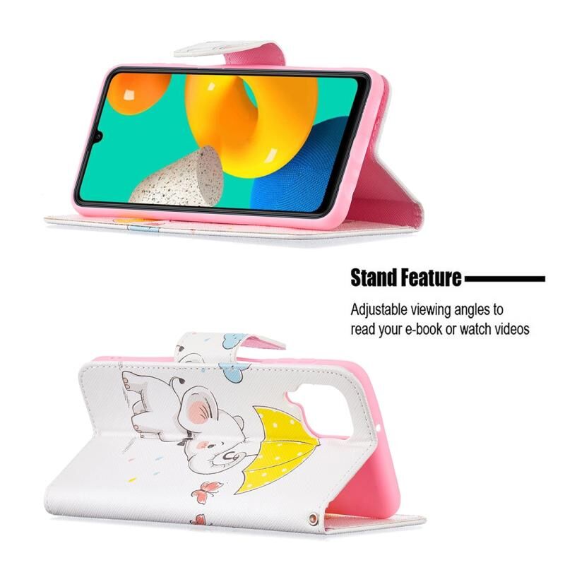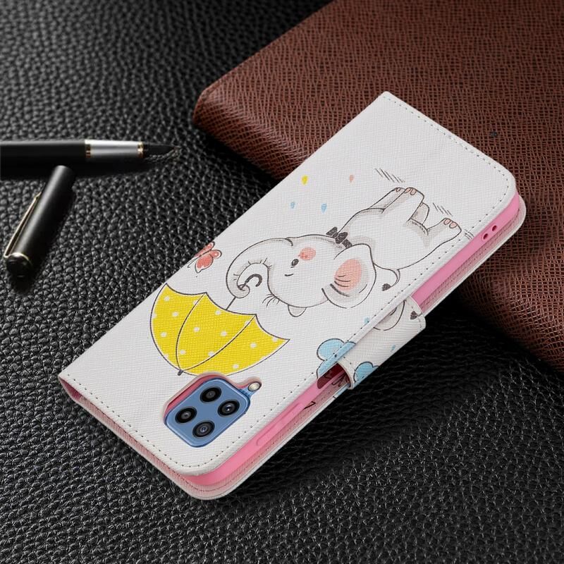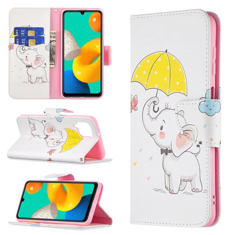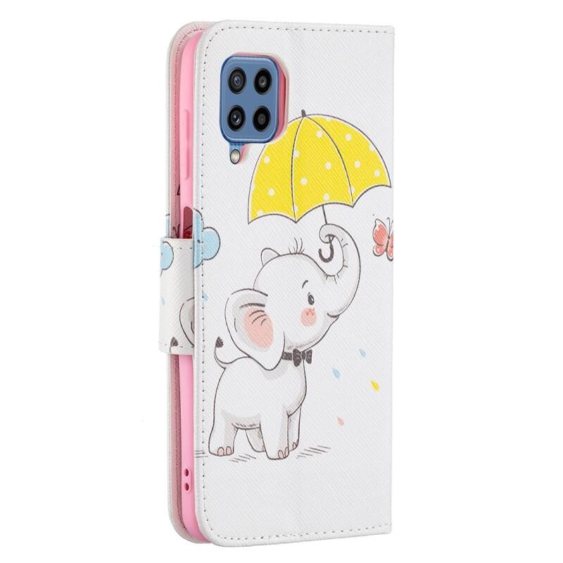 Θήκη Samsung Galaxy M32 με έγχρωμο σχέδιο, οριζόντια αναδιπλούμενη από δέρμα με βάση & θήκες για κάρτες & πορτοφόλι (Ελέφαντας κάτω από την ομπρέλα)