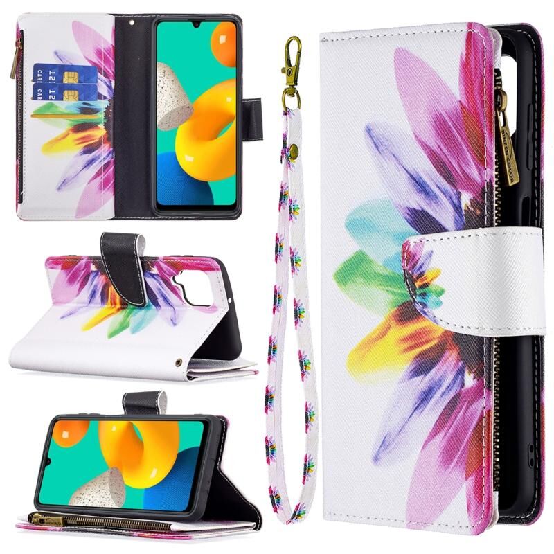 Θήκη Samsung Galaxy M32 με έγχρωμο σχέδιο, οριζόντια, δερμάτινη με φερμουάρ, βάση στήριξης & θήκες για κάρτες & πορτοφόλι (Ηλίανθος)