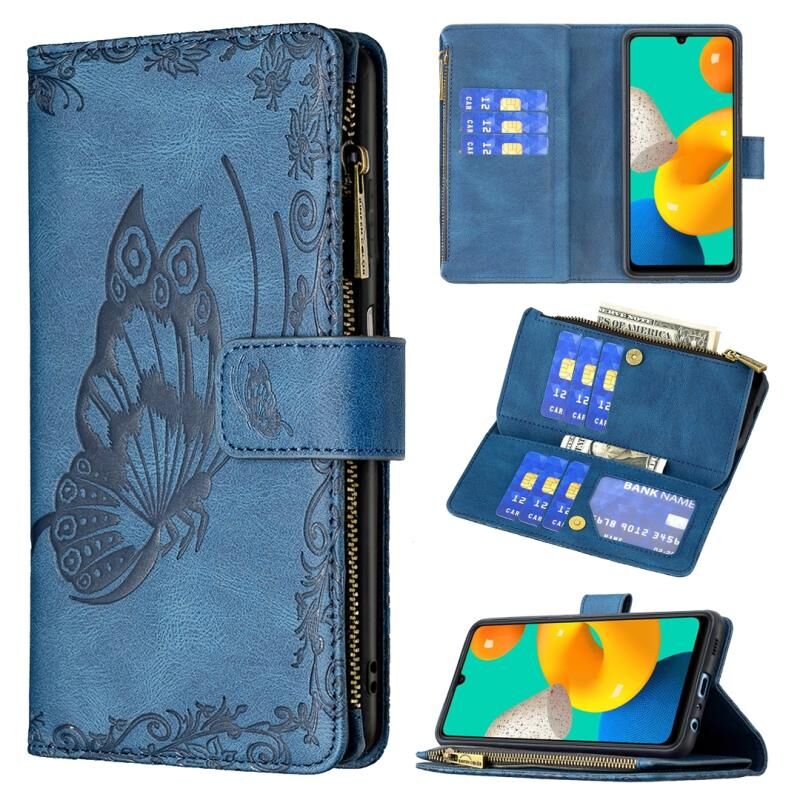 Για Samsung Galaxy M32 Flying πεταλούδα ανάγλυφο μοτίβο φερμουάρ οριζόντια Flip δερμάτινη θήκη με κάτοχο & υποδοχές για κάρτες & πορτοφόλι (μπλε)