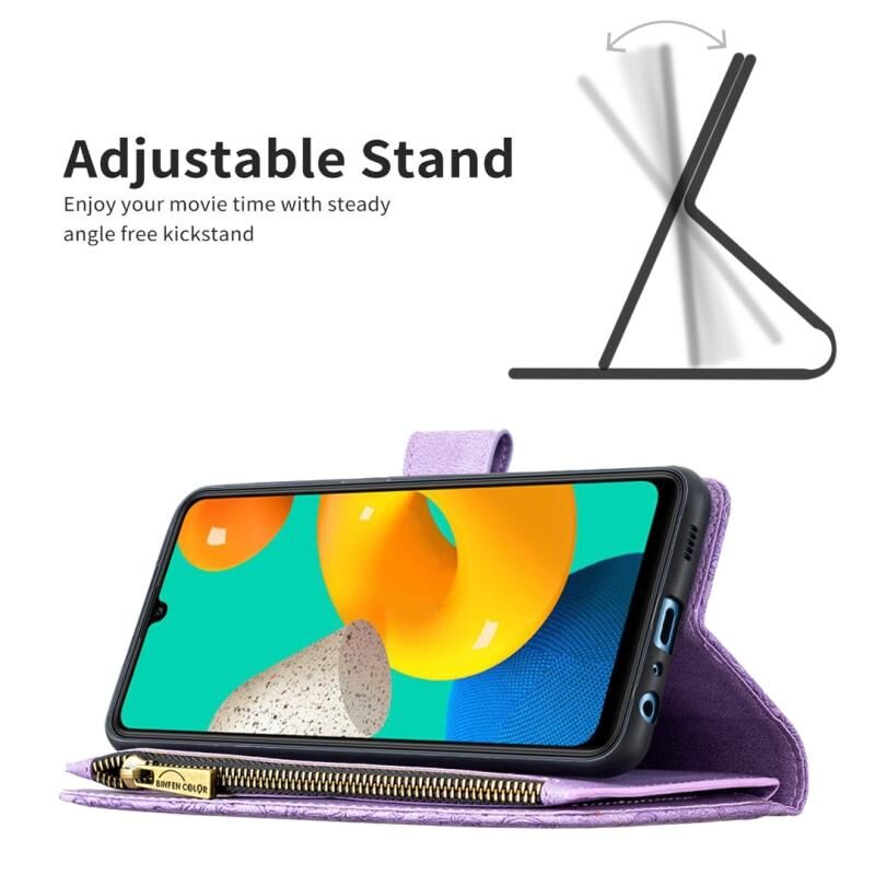 Για Samsung Galaxy M32 Flying πεταλούδα ανάγλυφο μοτίβο φερμουάρ οριζόντια Flip δερμάτινη θήκη με κάτοχο & υποδοχές για κάρτες & πορτοφόλι (μωβ)