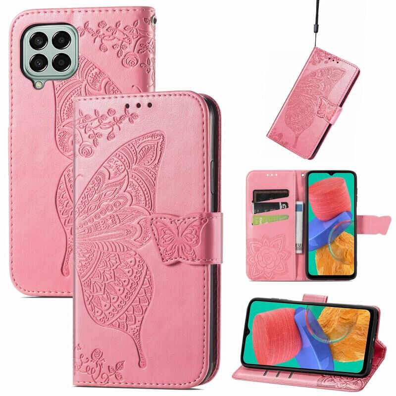 Θήκη τηλεφώνου Samsung Galaxy M33 4G, δερμάτινη, τύπου flip, με ανάγλυφο σχέδιο πεταλούδας και λουλουδιών (ρόζ)