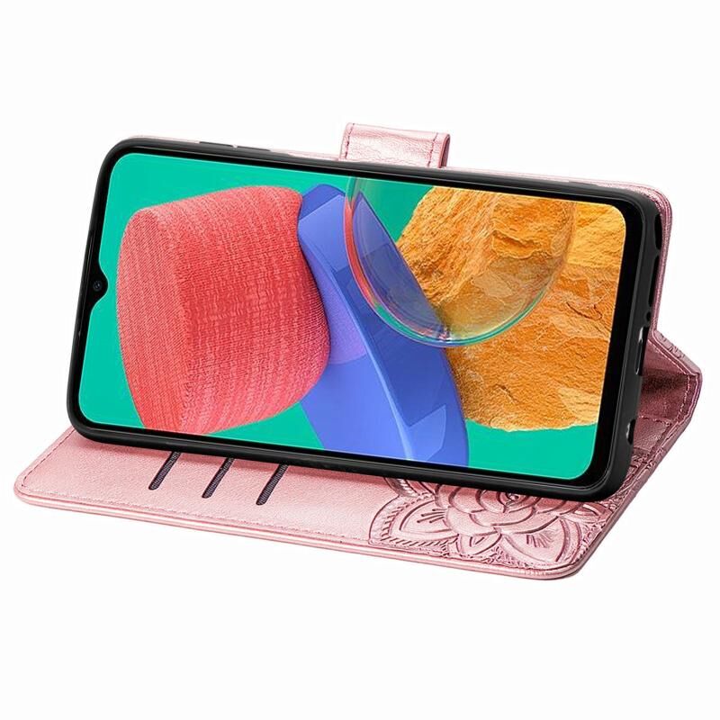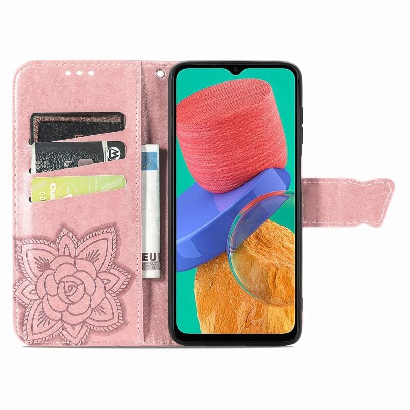 Θήκη τηλεφώνου Samsung Galaxy M33 4G, δερμάτινη, τύπου flip, με ανάγλυφο σχέδιο πεταλούδας και λουλουδιών (Ροζ χρυσός)