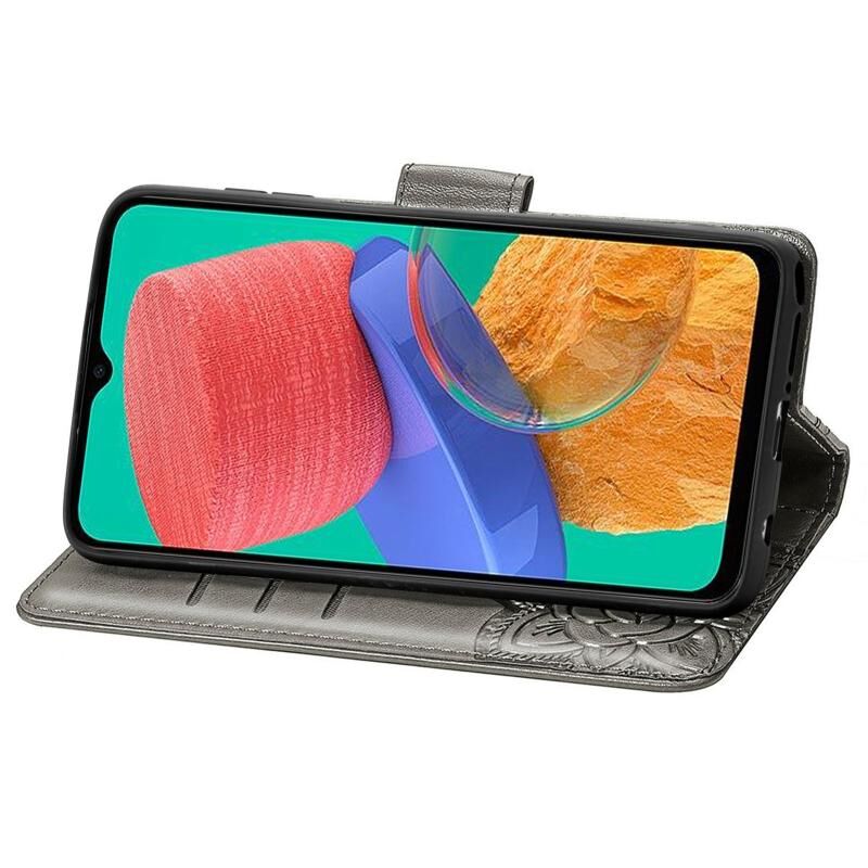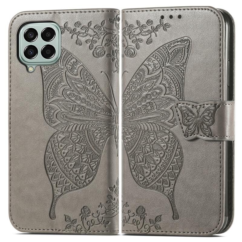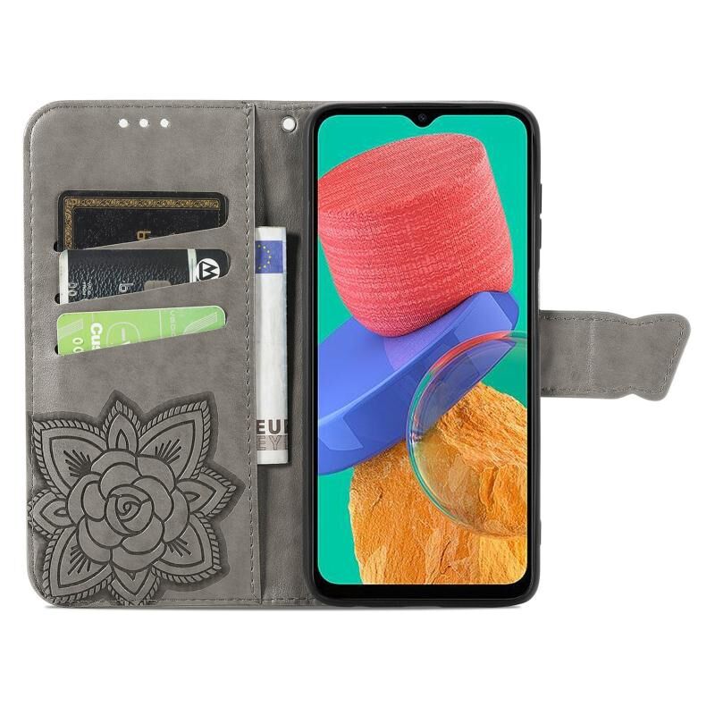 Θήκη τηλεφώνου Samsung Galaxy M33 5G, δερμάτινη, τύπου flip, με ανάγλυφο σχέδιο πεταλούδας και λουλουδιών (Μαύρο)