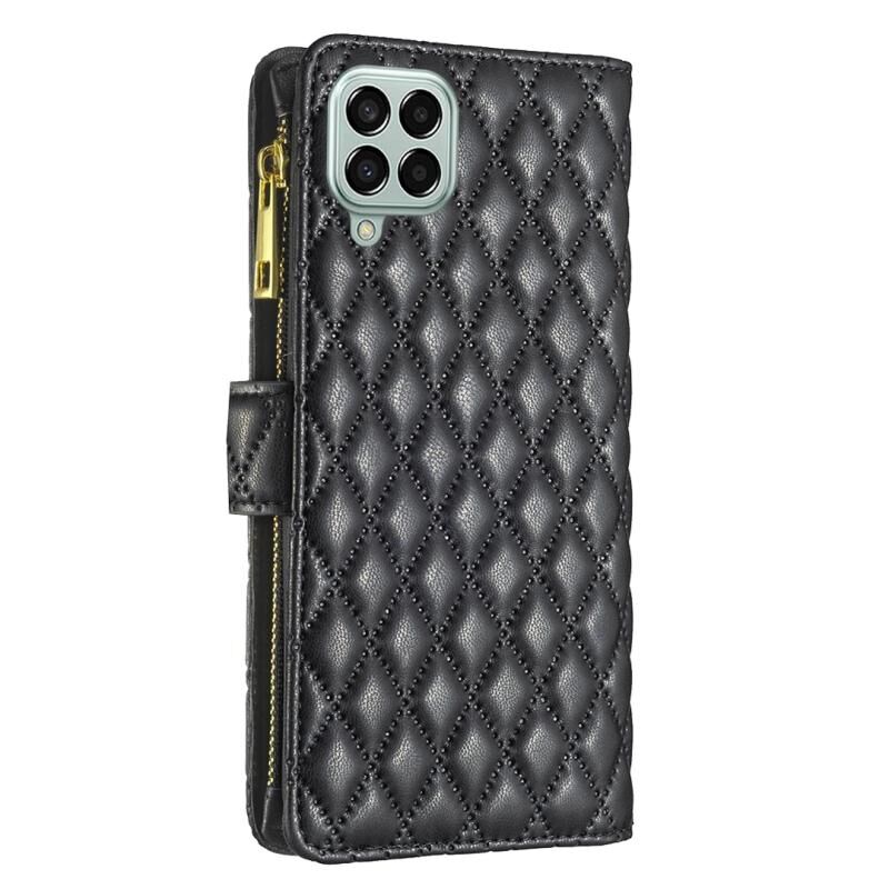 Θήκη τηλεφώνου Samsung Galaxy M33 5G, Δερμάτινη θήκη τύπου πορτοφολιού με φερμουάρ και διαμαντένιο πλέγμα (Λευκό)