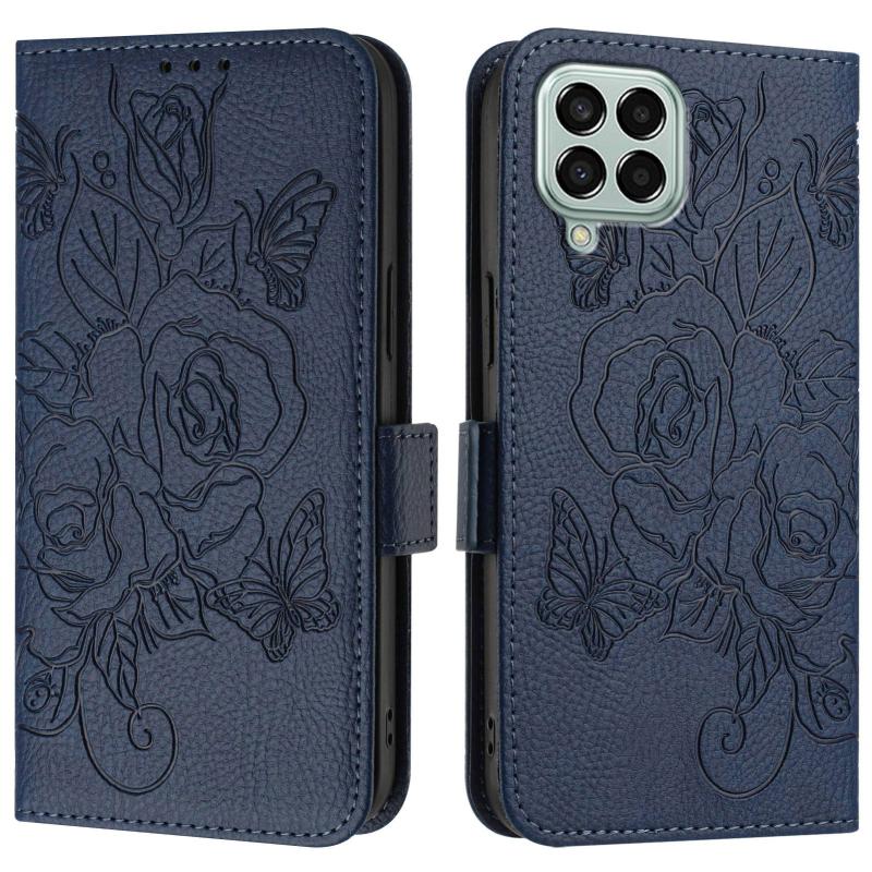 For Samsung Galaxy M33 5G Global Embossed Rose RFID Anti-theft Leather Phone Case(Dark Blue)