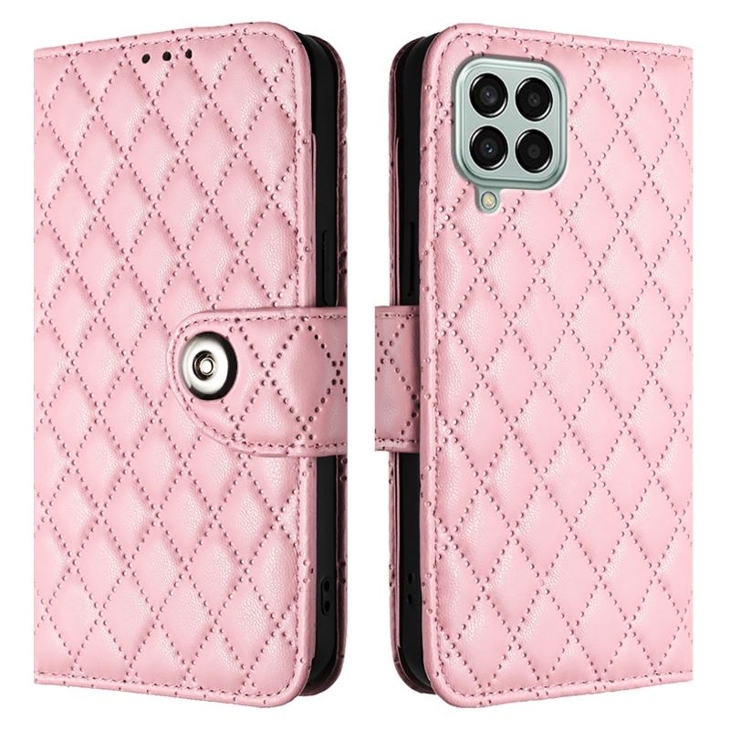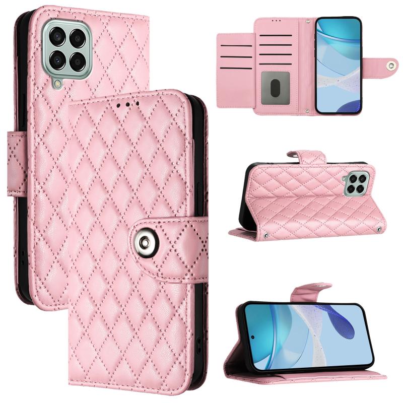 For Samsung Galaxy M33 5G Global Rhombic Texture Flip Leather Phone Case with Lanyard(Pink)