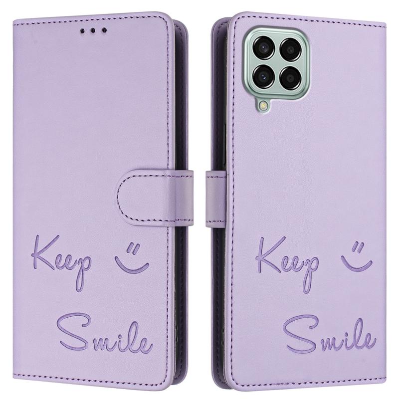 For Samsung Galaxy M33 5G Global Smile Embossing RFID Leather Phone Case(Light Purple)