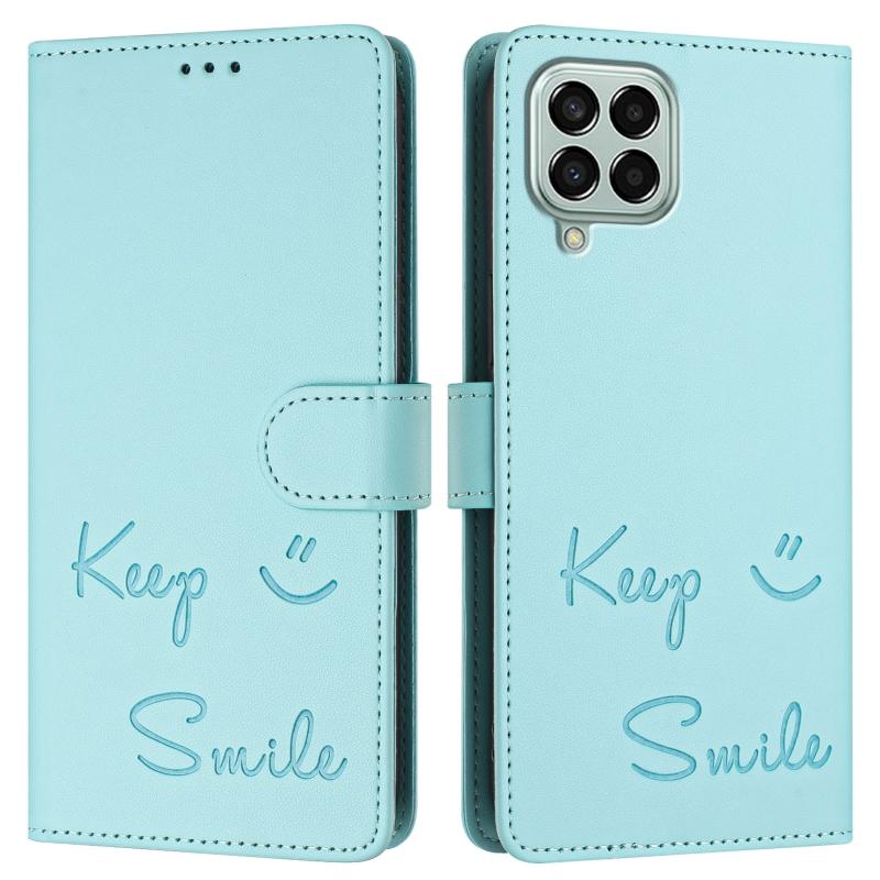 For Samsung Galaxy M33 5G Global Smile Embossing RFID Leather Phone Case(Mint Green)