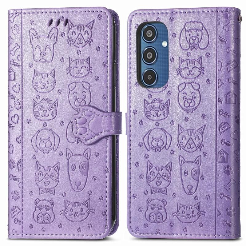Θήκη τηλεφώνου Samsung Galaxy M35 με ανάγλυφο σχέδιο γάτας και σκύλου από δέρμα (Μωβ)