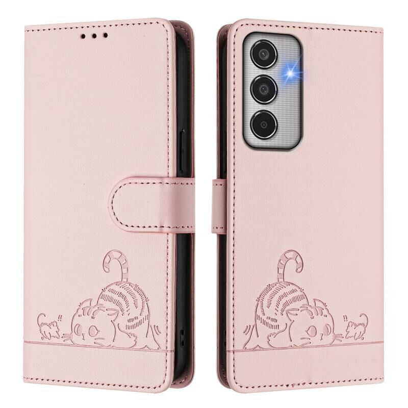 Θήκη κινητού Samsung Galaxy M35 με ανάγλυφο σχέδιο γάτας και ποντικιού, από δέρμα με προστασία RFID και λουρί (ρόζ)
