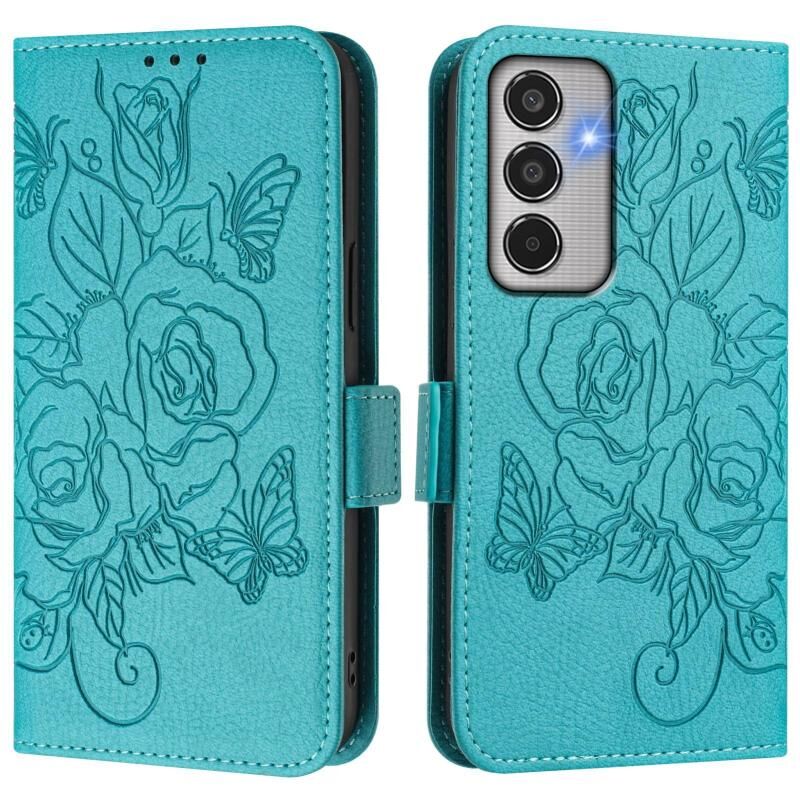 For Samsung Galaxy M35 Embossed Rose RFID Anti-theft Leather Phone Case(Light Blue)