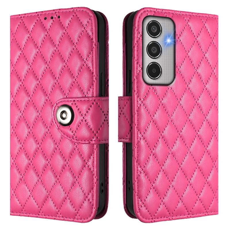 Θήκη τηλεφώνου Samsung Galaxy M35 με δερμάτινη υφή ρόμβου και λουρί (Ροζέ κόκκινο)