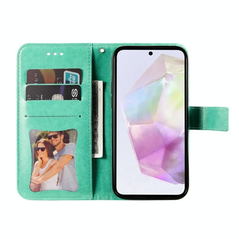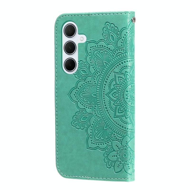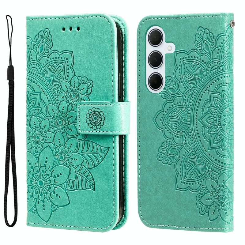 Για Samsung Galaxy M35 Επτά-πέταλο λουλούδια ανάγλυφη δερμάτινη θήκη τηλεφώνου (πράσινο)