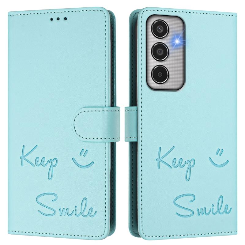 For Samsung Galaxy M35 Smile Embossing RFID Leather Phone Case(Mint Green)