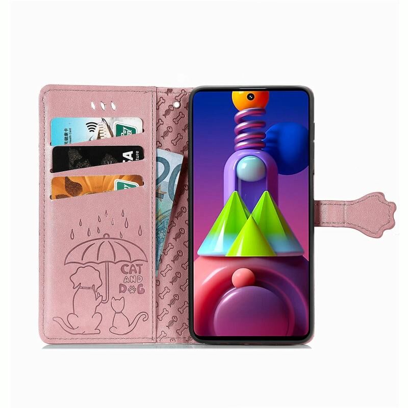 Για Samsung Galaxy M51 Χαριτωμένη γάτα και σκύλος ανάγλυφη οριζόντια Flip δερμάτινη θήκη με στήριγμα / υποδοχή για κάρτες / πορτοφόλι / κορδόνι (Rolse Gold)