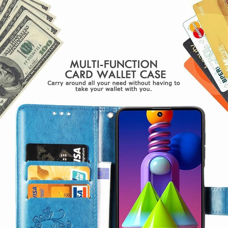 Θήκη δερμάτινη για Samsung Galaxy M51 με σχέδιο τριφυλλιού, ανάγλυφο κούμπωμα, προστασία κινητού, λουρί, θήκη για κάρτες, πορτοφόλι και λειτουργία βάσης (Κόκκινο του Ρόδου)