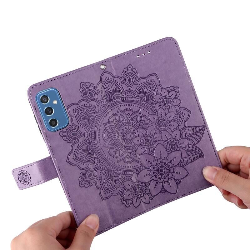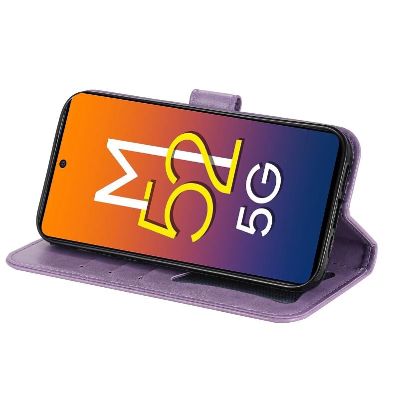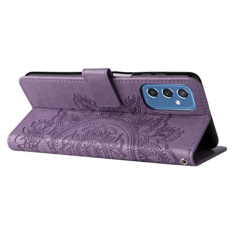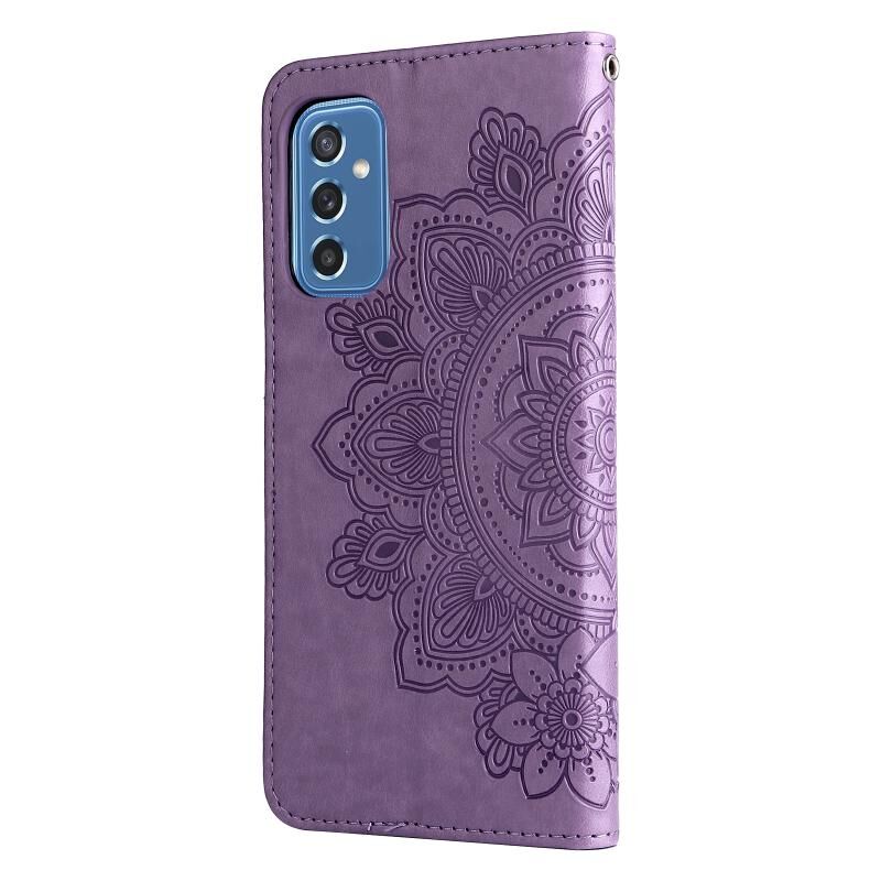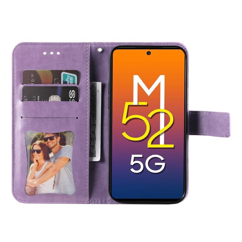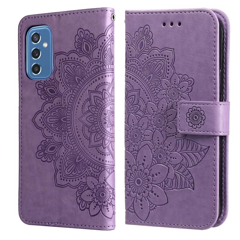 Για Samsung Galaxy M52 5G 7-πέταλο λουλούδια ανάγλυφο Flip δερμάτινη θήκη τηλεφώνου με θήκη & υποδοχές για κάρτες (ανοιχτό μοβ)