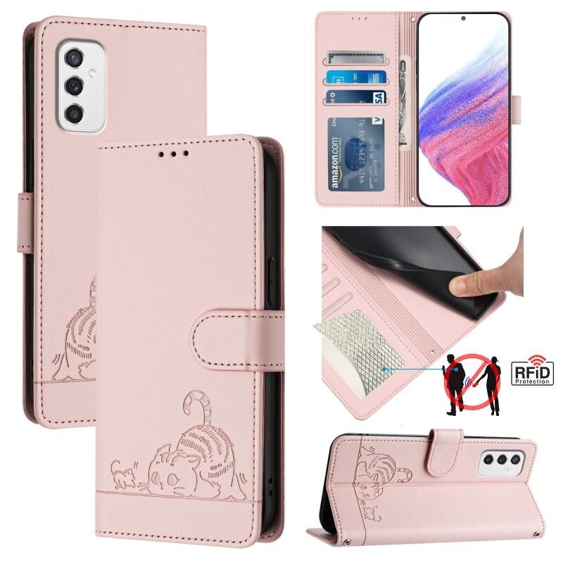 Θήκη τηλεφώνου Samsung Galaxy M52 5G από δέρμα με ανάγλυφο σχέδιο γάτας και ποντικιού, με κορδόνι (Μέντας Πράσινο)