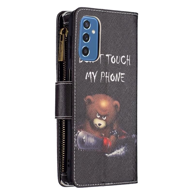 Θήκη δέρματος οριζόντιας αναδίπλωσης για Samsung Galaxy M52 5G με έγχρωμο σχέδιο, φερμουάρ, βάση στήριξης & θήκες για κάρτες & πορτοφόλι (Αρκούδα)