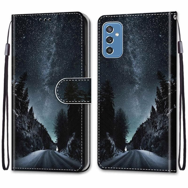 Θήκη τηλεφώνου Samsung Galaxy M52 5G από δέρμα με οριζόντιο άνοιγμα, πολύχρωμο σχέδιο με σταυρωτή υφή, με βάση στήριξης, θήκες για κάρτες, πορτοφόλι και κορδόνι (Ορεινός Δρόμος με Αστρόσκονη).