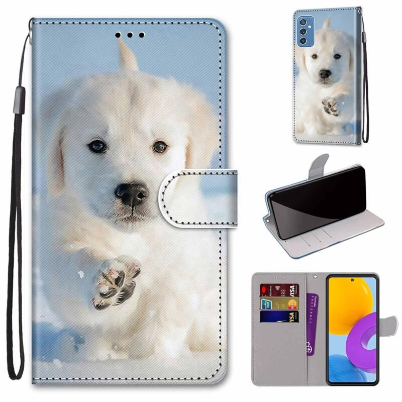 Θήκη τηλεφώνου Samsung Galaxy M52 5G από δέρμα με οριζόντιο άνοιγμα, πολύχρωμο σχέδιο, ανάγλυφη υφή, με βάση στήριξης, θήκες για κάρτες, πορτοφόλι και κορδόνι (Snow Puppy)