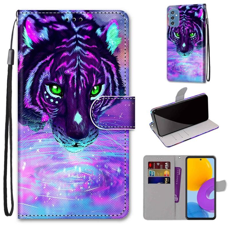 Θήκη τηλεφώνου Samsung Galaxy M52 5G από δέρμα με οριζόντιο άνοιγμα, πολύχρωμο σχέδιο με σταυρωτή υφή, με βάση, θήκες καρτών, πορτοφόλι και κορδόνι (Τίγρης που πίνει νερό)