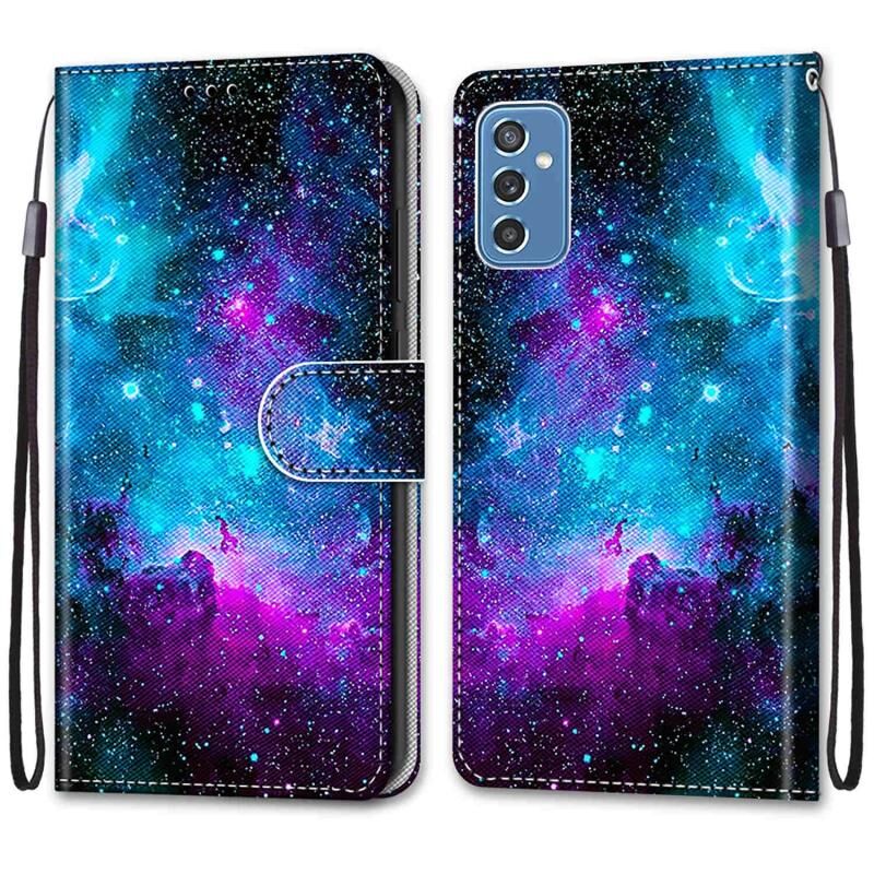 Θήκη τηλεφώνου Samsung Galaxy M52 5G από δέρμα PU με οριζόντιο άνοιγμα, πολύχρωμο σχέδιο με σταυρωτή υφή, με βάση, θήκες καρτών, πορτοφόλι και κορδόνι (Πολύχρωμο στρώμα (Χρυσή αλυσίδα, Γκρίζο Γάτα))