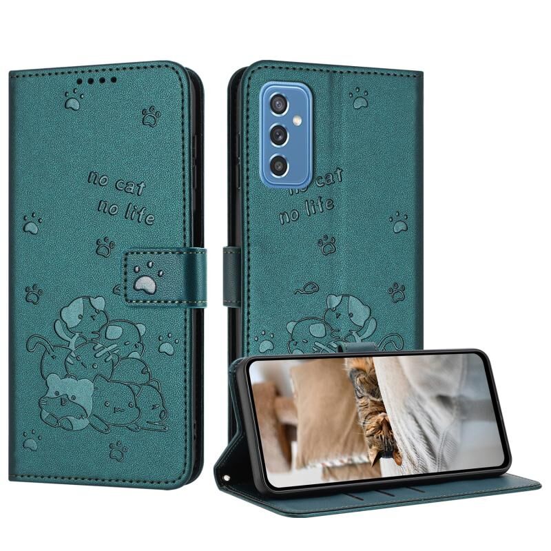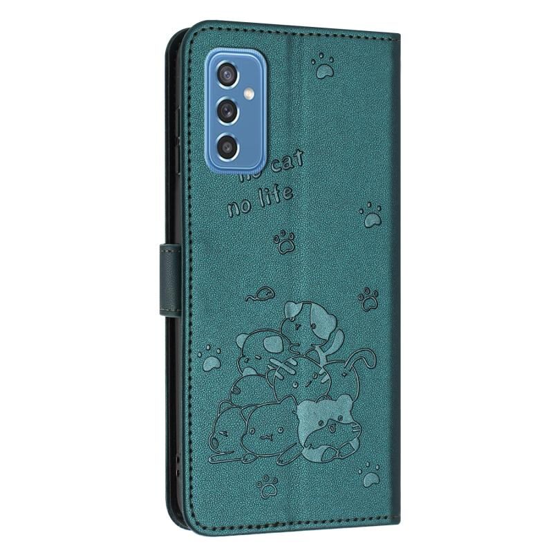Θήκη δερμάτινη για Samsung Galaxy M52 5G με ανάγλυφο γατάκι και κορδόνι (Μωβ)