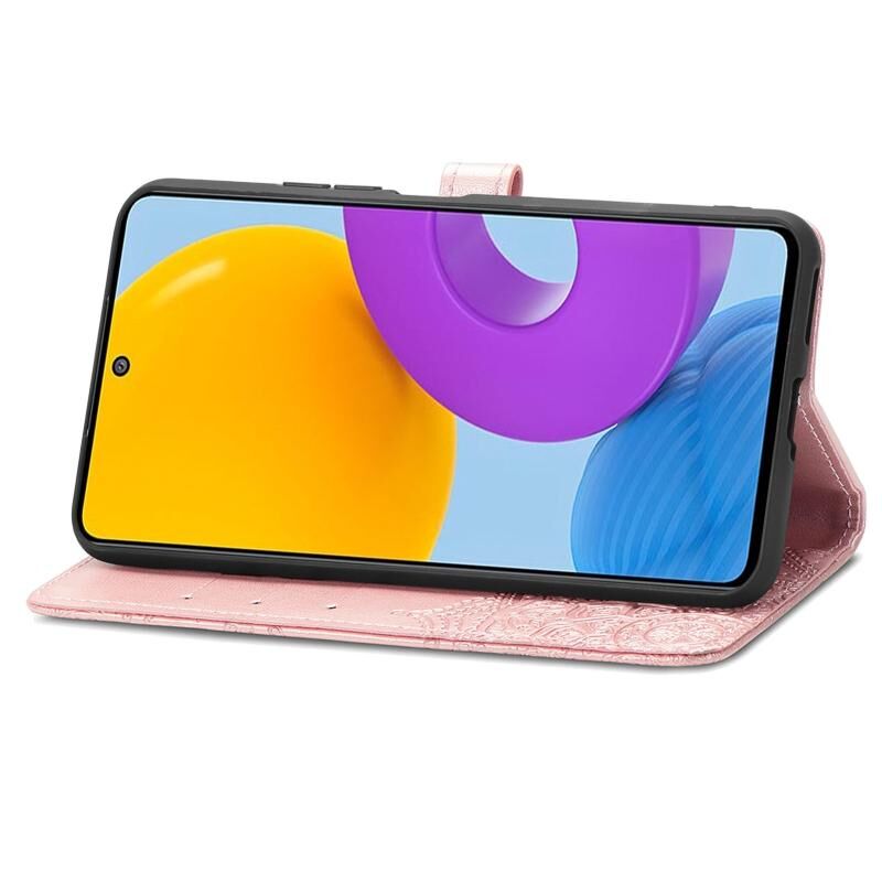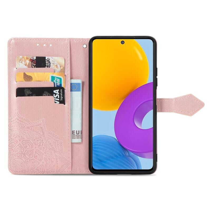 Για Samsung Galaxy M52 5G Mandala λουλούδι ανάγλυφο οριζόντια Flip δερμάτινη θήκη με υποδοχές για κάρτες & υποδοχές & πορτοφόλι & κορδόνι (Ροζ χρυσός)