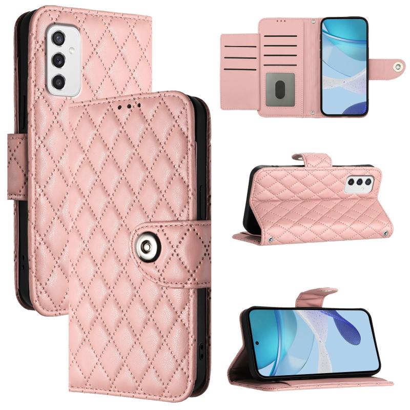 For Samsung Galaxy M52 5G Rhombic Texture Flip Leather Phone Case with Lanyard(Coral Pink)