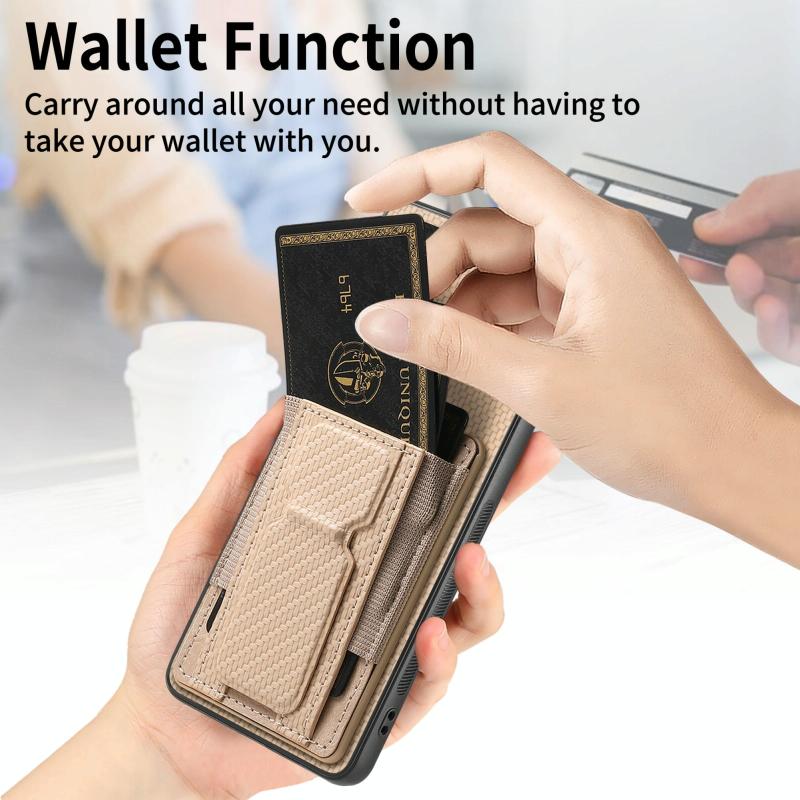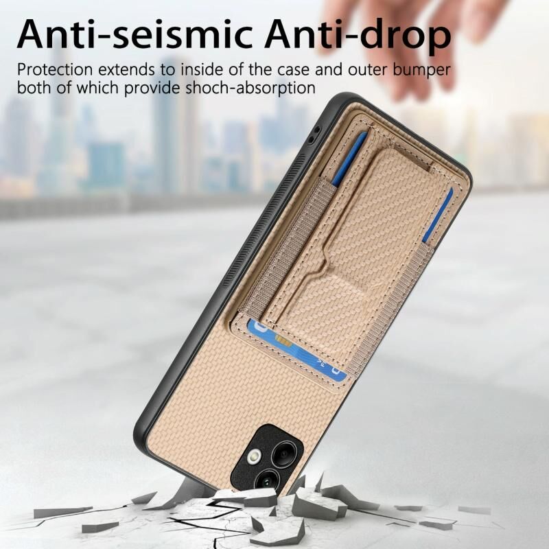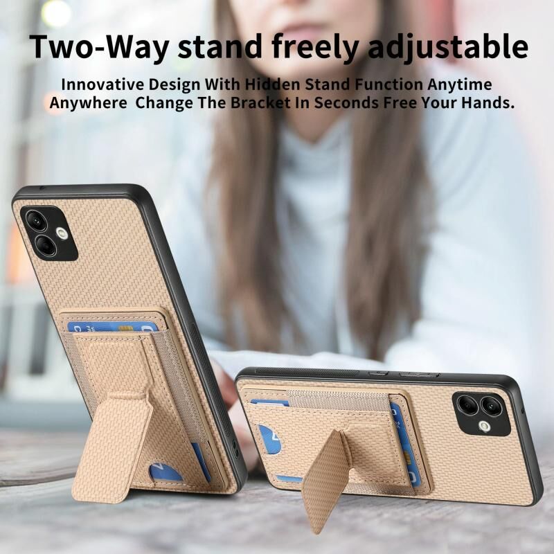 For Samsung Galaxy M53 5G Carbon Fiber Fold Stand Elastic Card Bag Phone Case(Khaki)