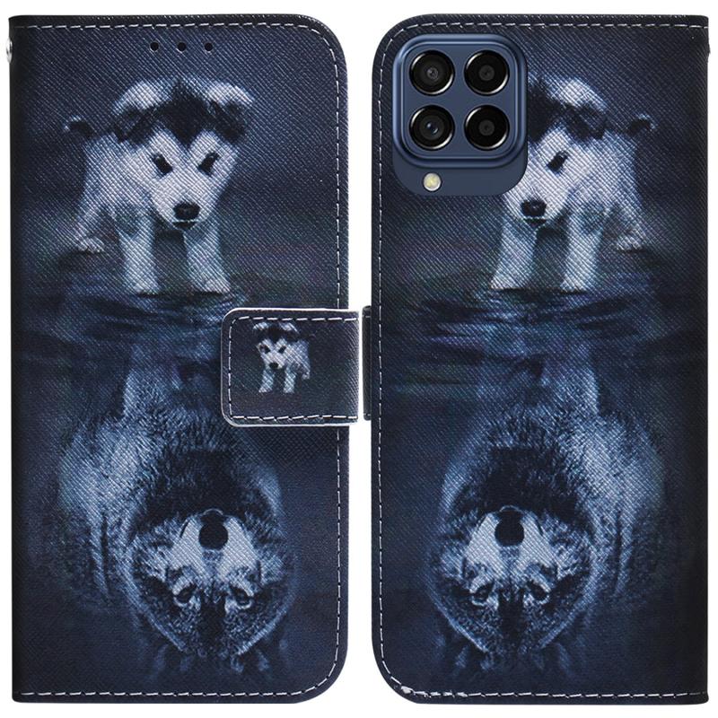 For Samsung Galaxy M53 5G Coloured Drawing Leather Phone Case(Wolf and Dog)